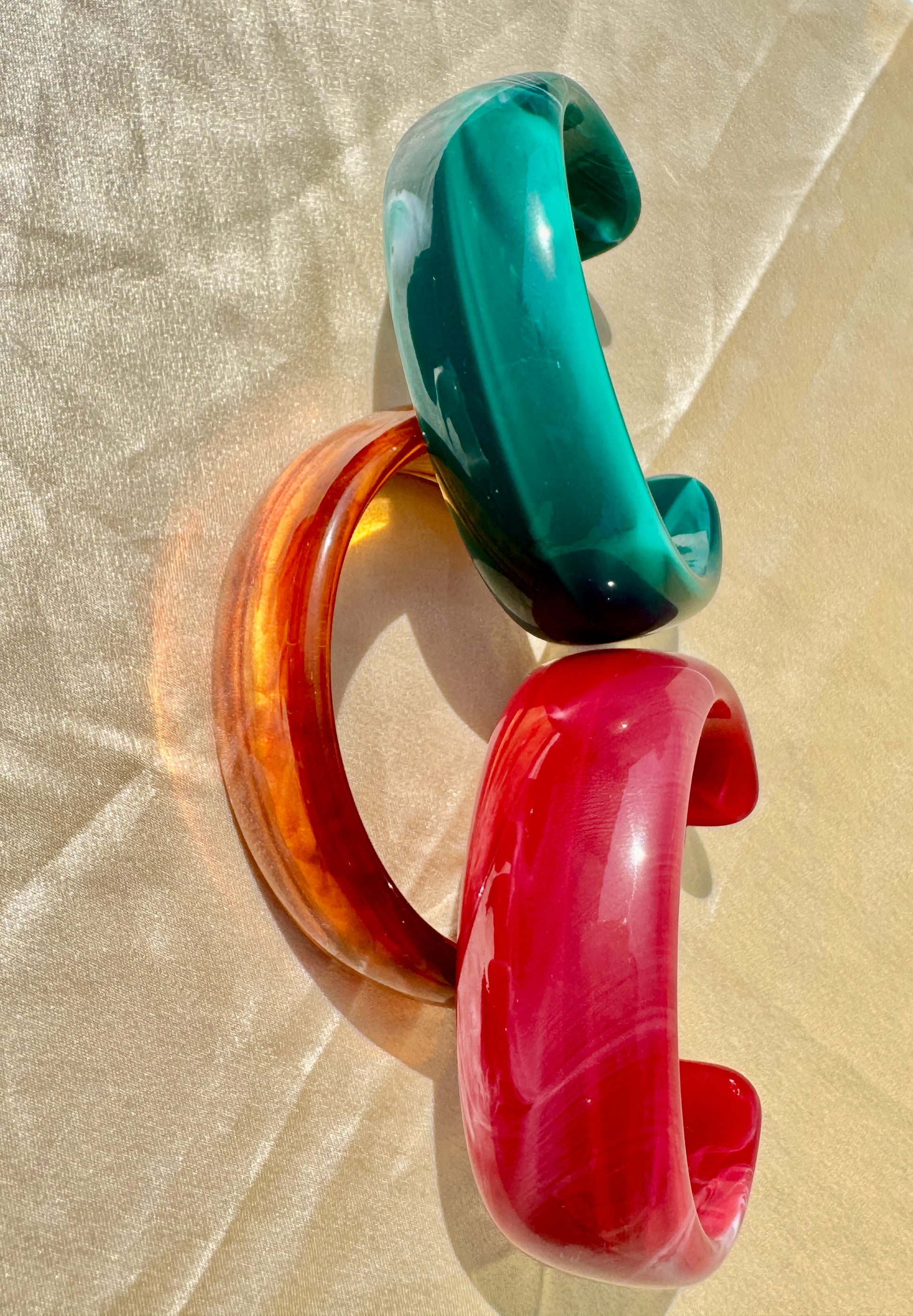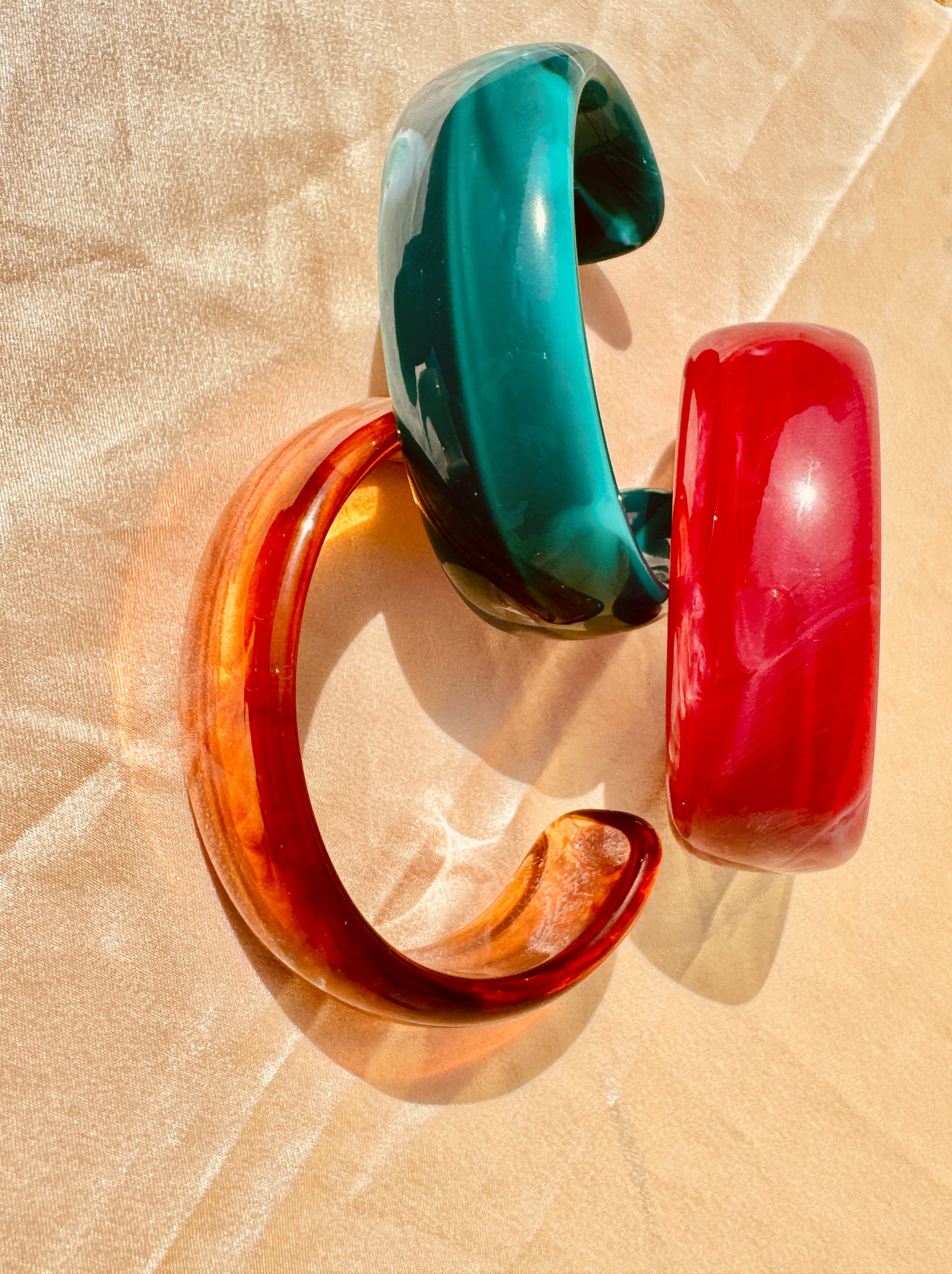 Daring, radiant, and irresistibly vibrant — Aureon celebrates the spectrum of modern artistry with a captivating trio of resin cuffs. Designed in rich jewel tones, this set blends fiery crimson, emerald allure, and amber warmth, creating a prism of colors that shift and shine with every glance.