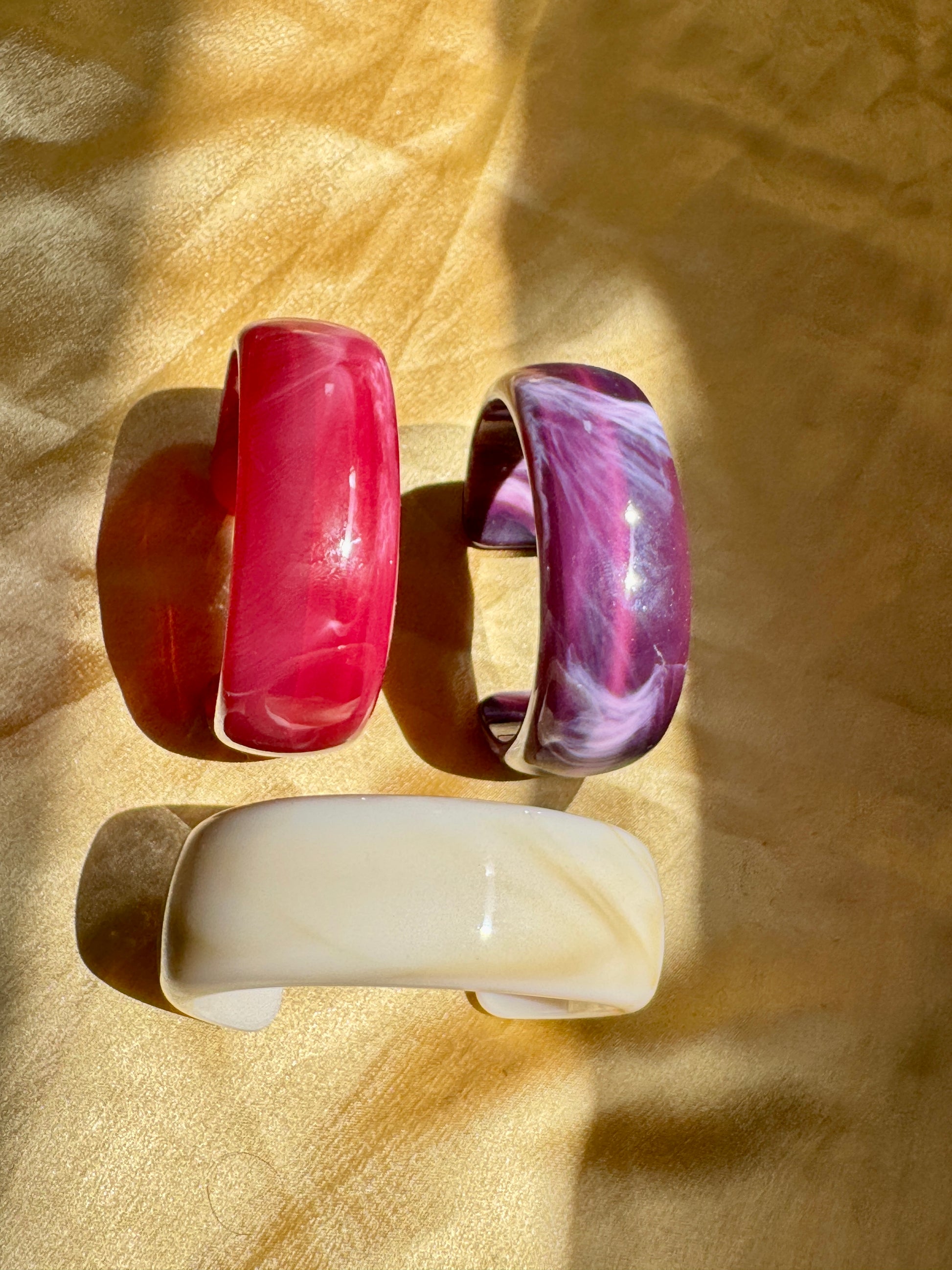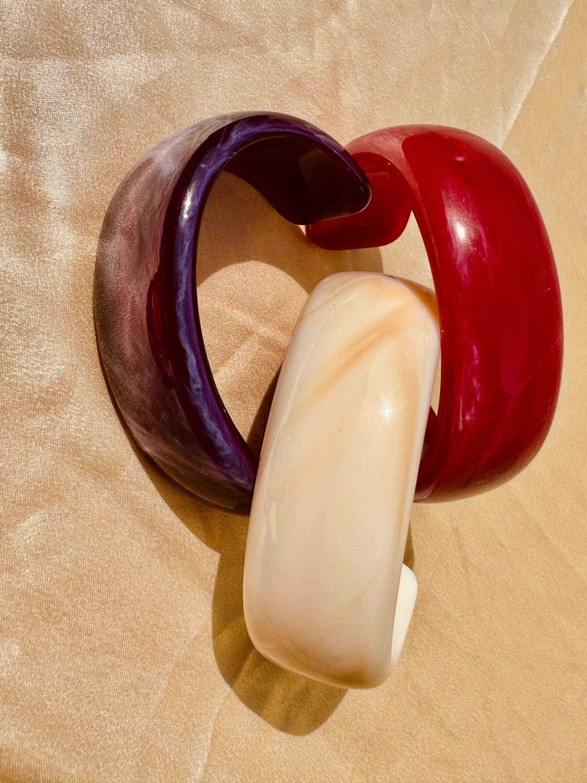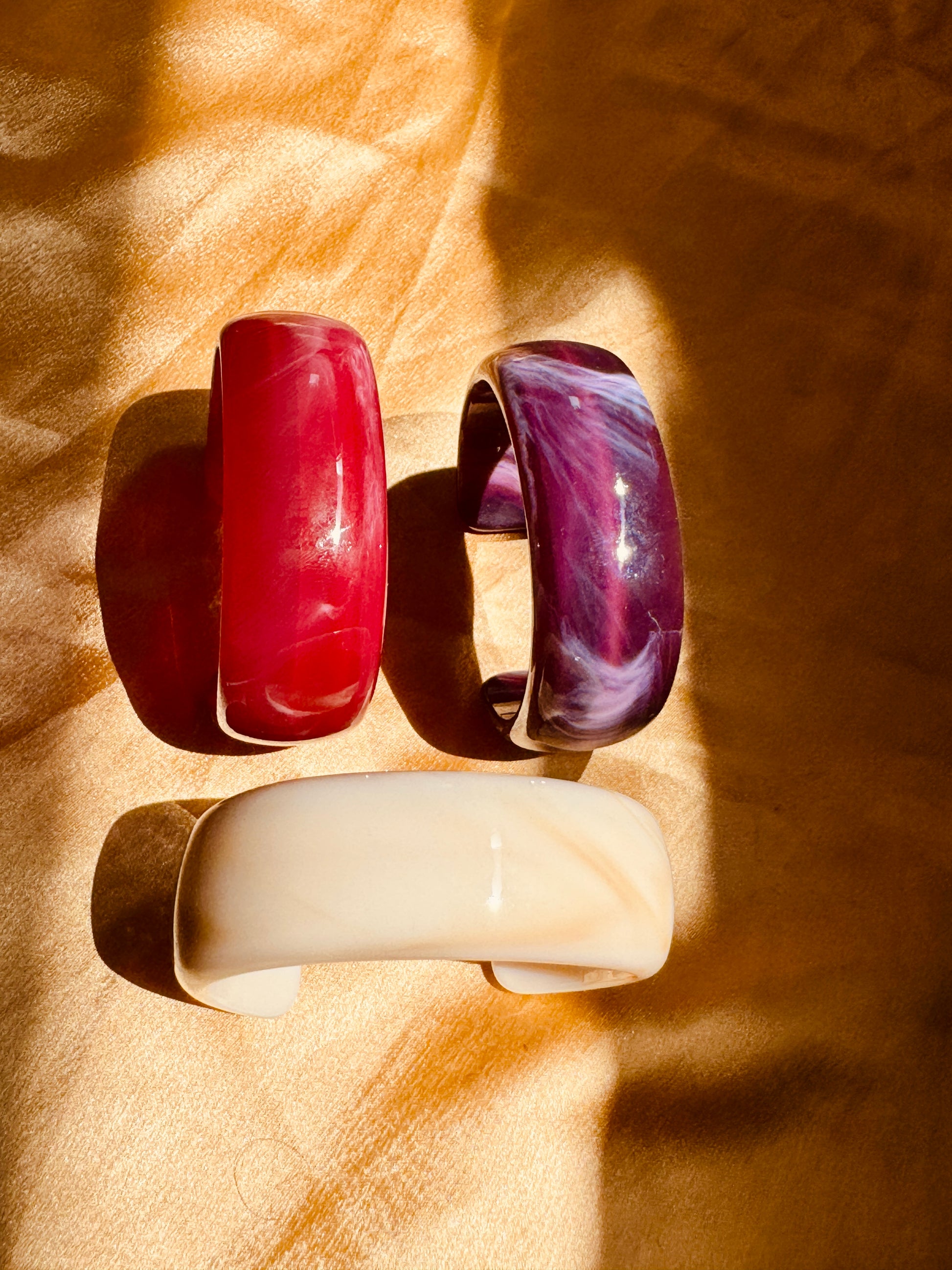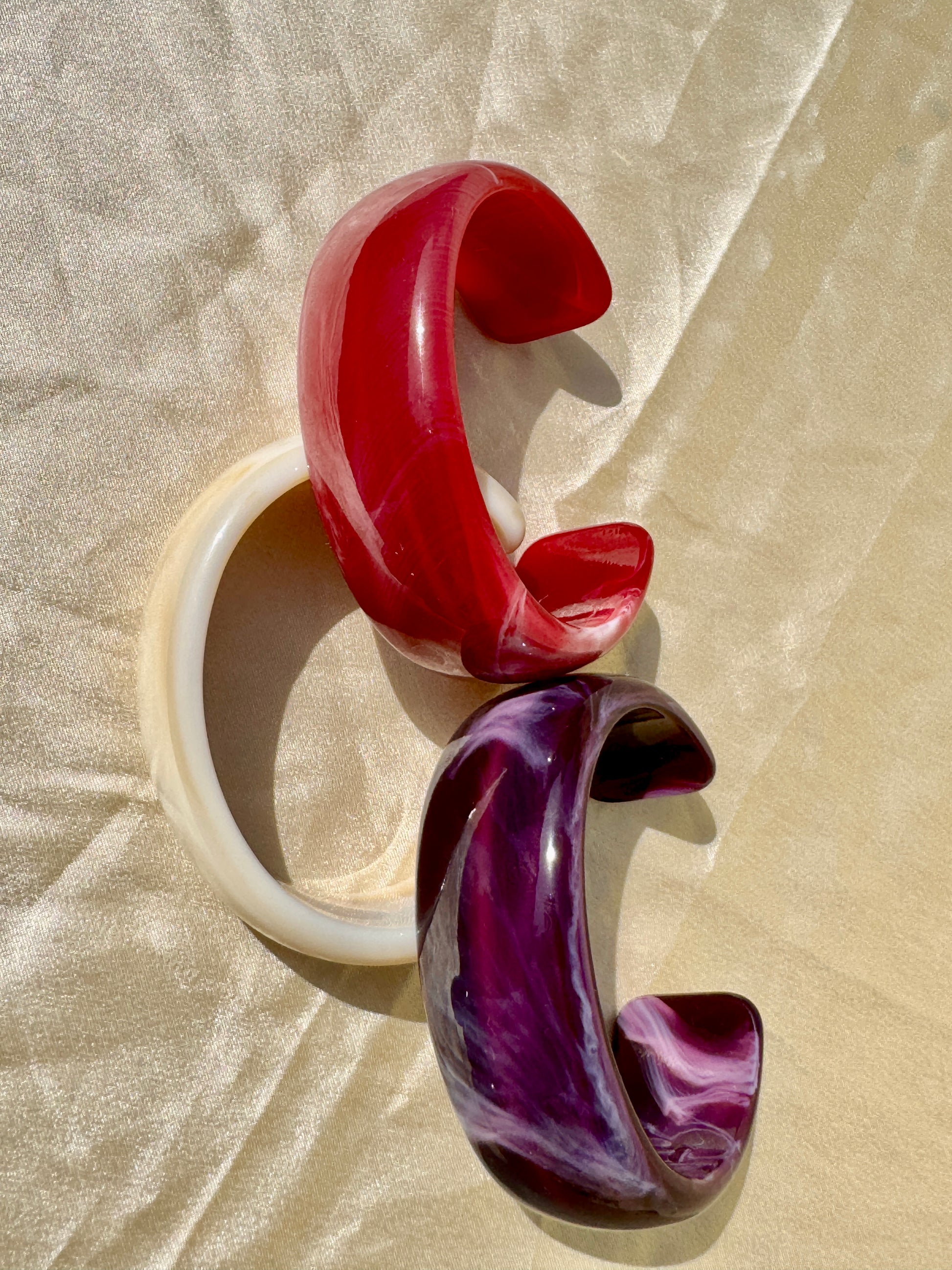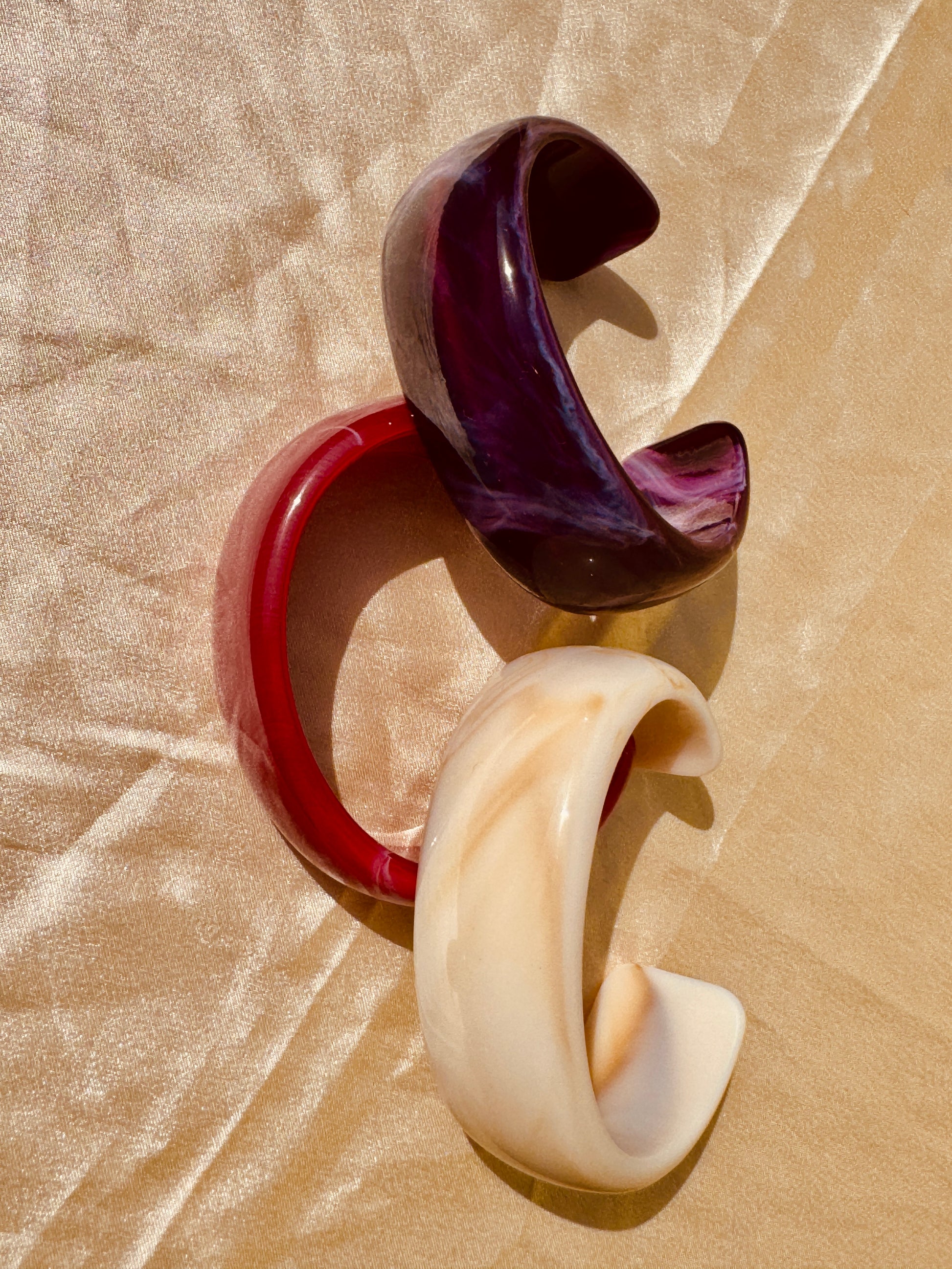 Unveil the radiance of Aurevia — an ode to bold individuality and timeless grace. Designed in luxurious resin, this striking cuff trio blends deep ruby, royal plum, and soft ivory tones, capturing the mesmerizing beauty of celestial auroras.