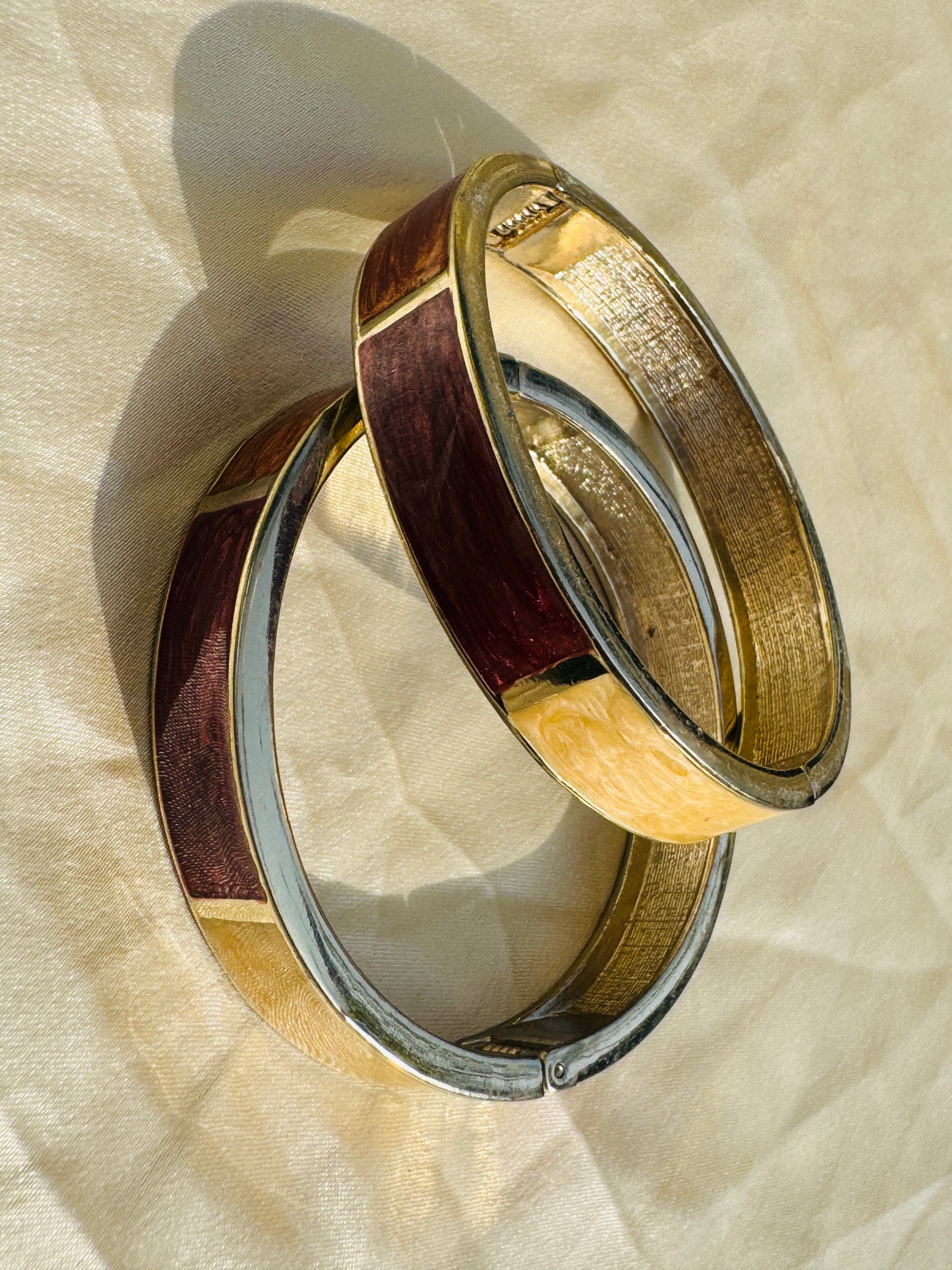 A luxurious pair of gold-plated bangles featuring rich maroon enamel paired with warm cream enamel panels