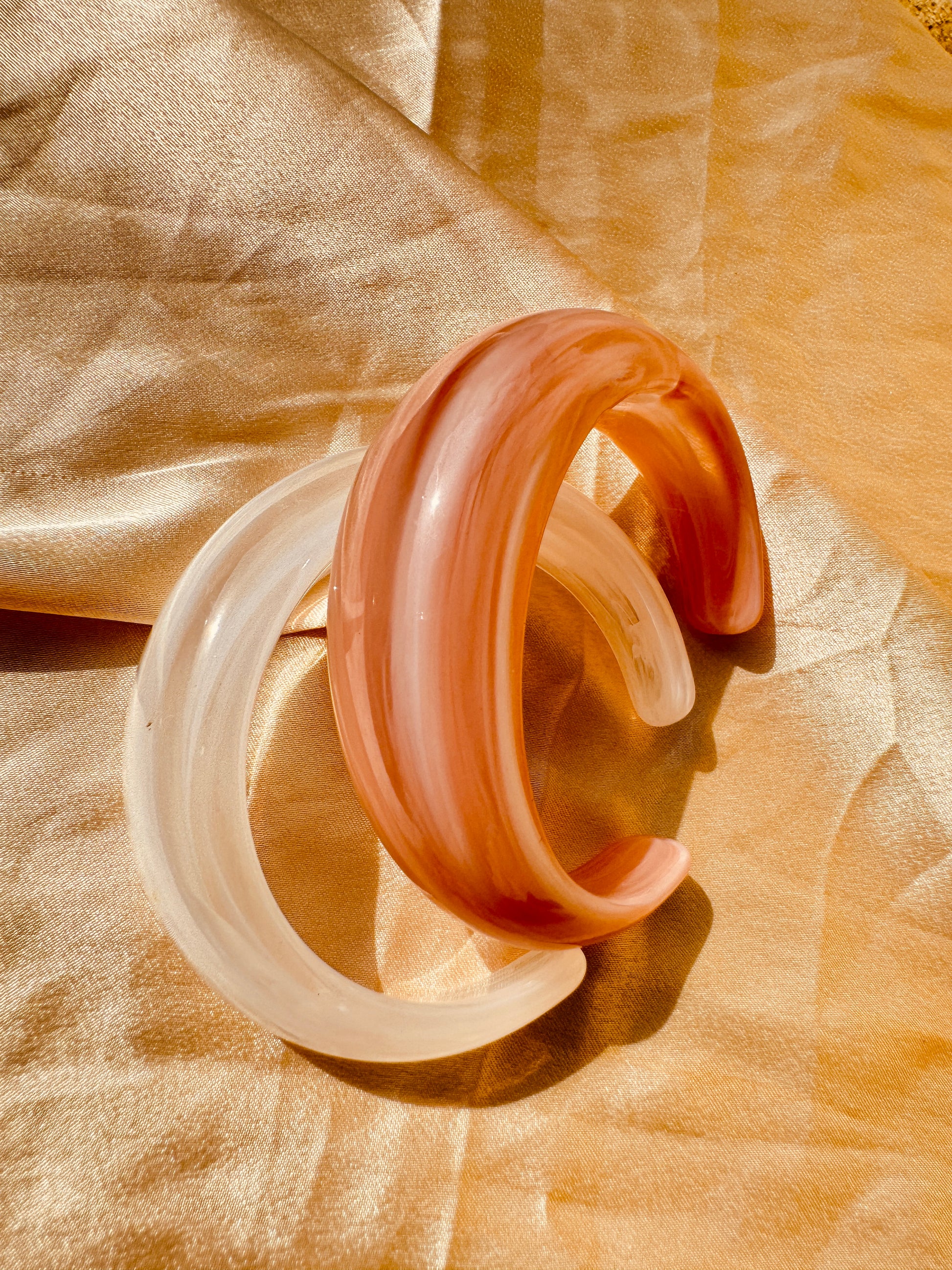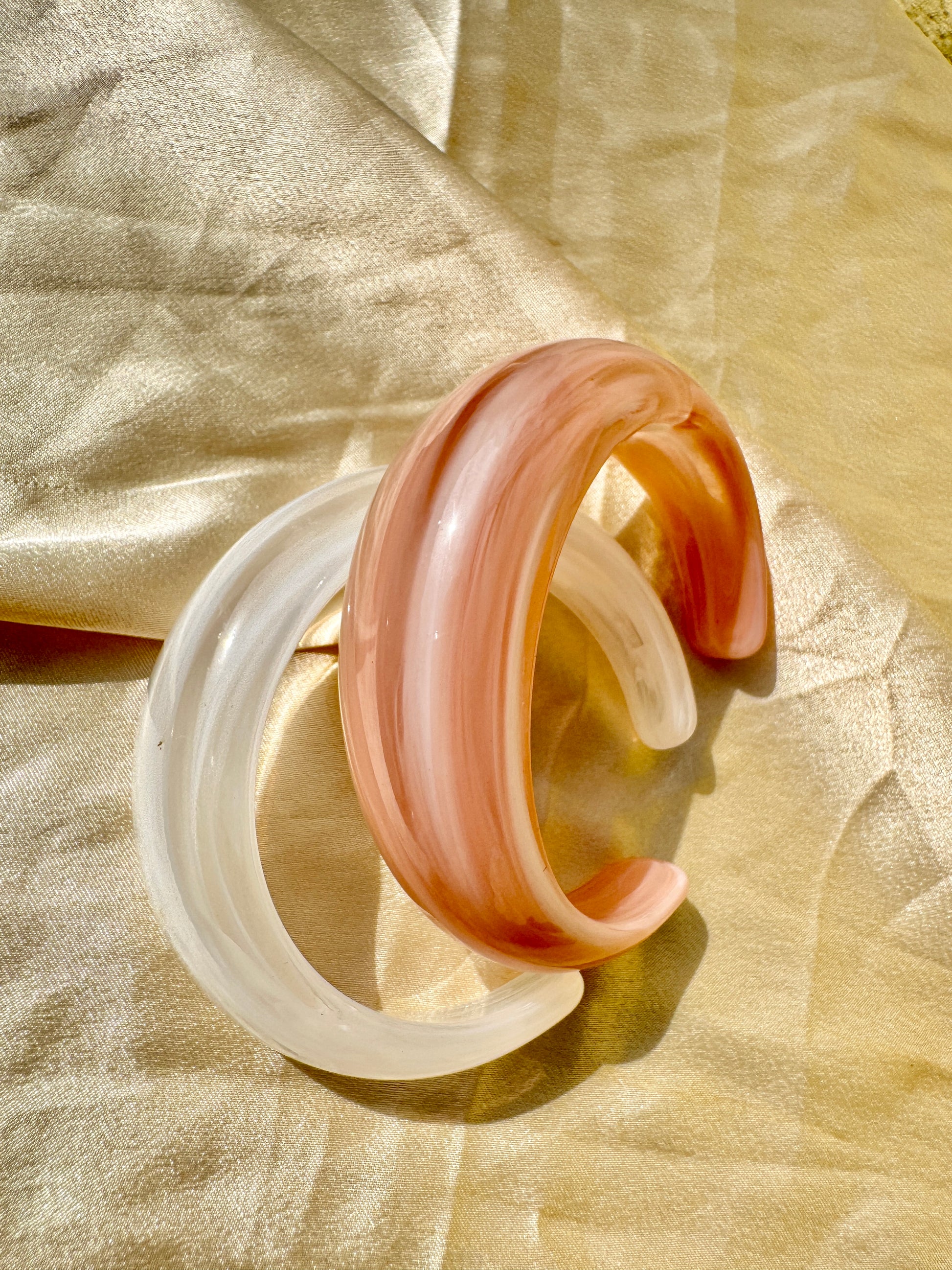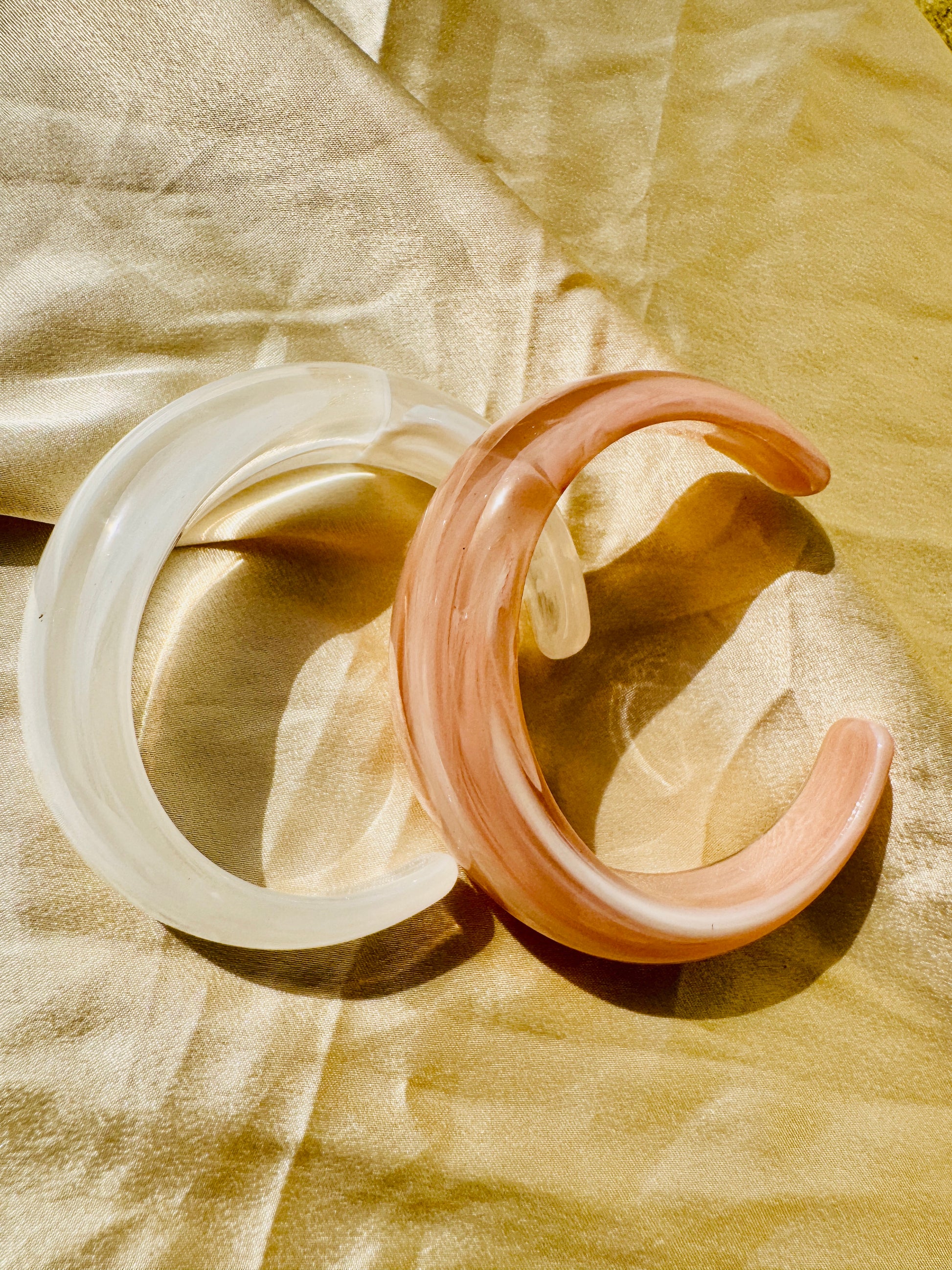 Step into a world of refined minimalism with Evalyn, a stunning resin cuff duo designed to capture the essence of timeless femininity. Featuring a creamy ivory and a blush rose cuff, this set blends soft romantic tones with fluid sculptural curves for a look that’s effortlessly elegant and modern.