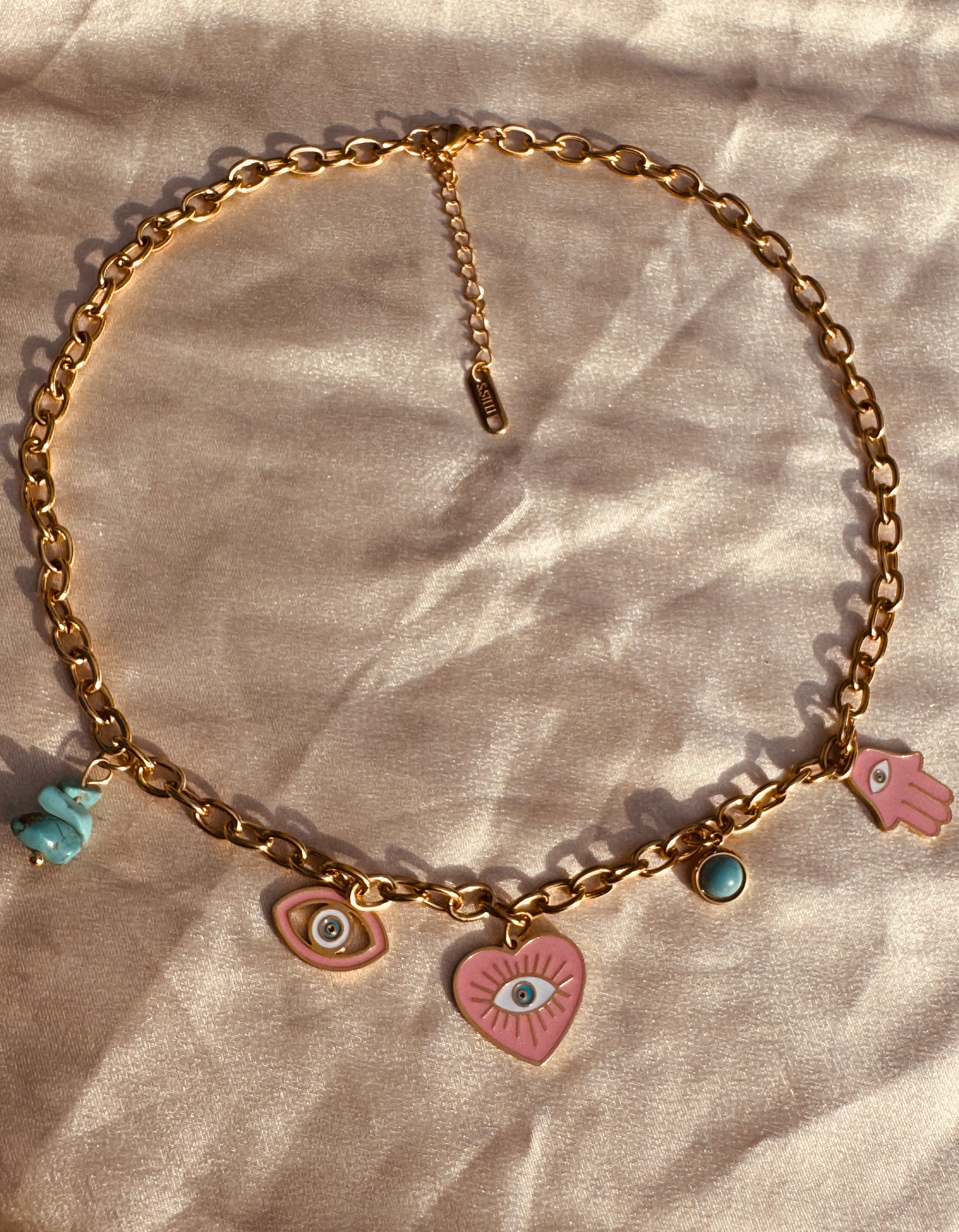 Features signature pink evil-eye charms: heart-eye, side-eye, and hamsa hand for a mystical, aesthetic vibe