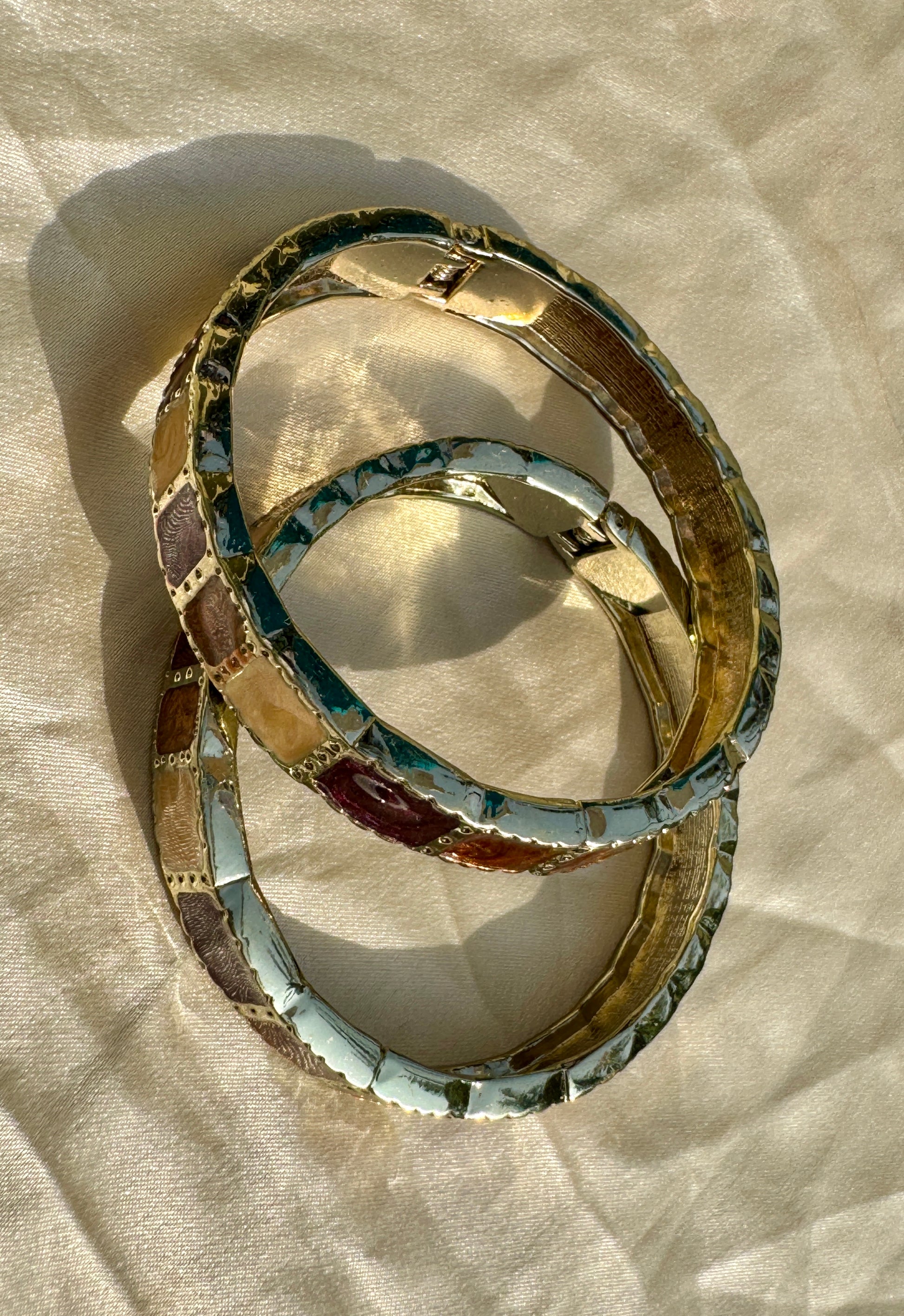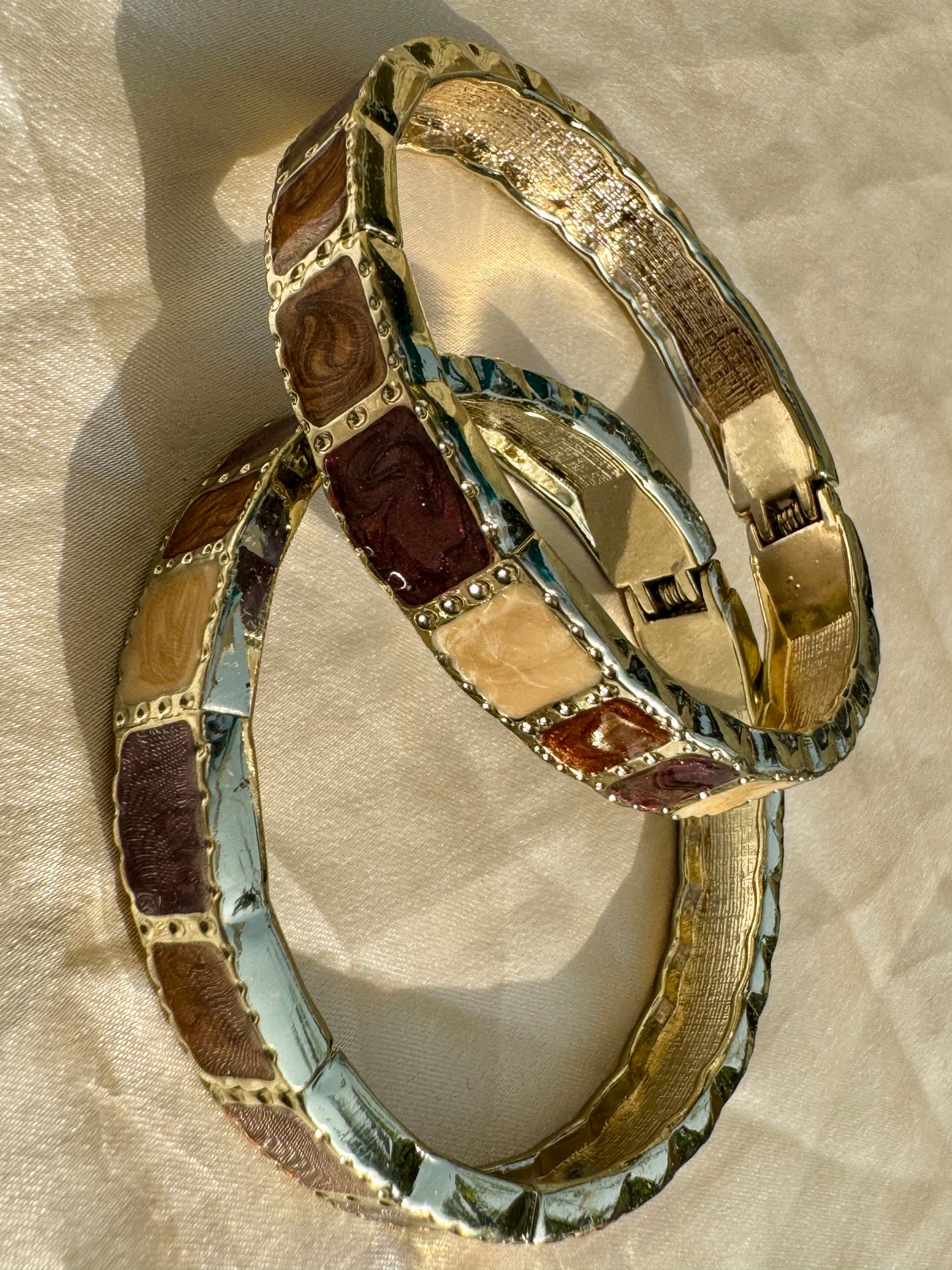 A luxurious pair of gold-plated bangles featuring mosaic-style enamel tiles in rich tones — teal, maroon, caramel, sand, nude, and earthy brown
