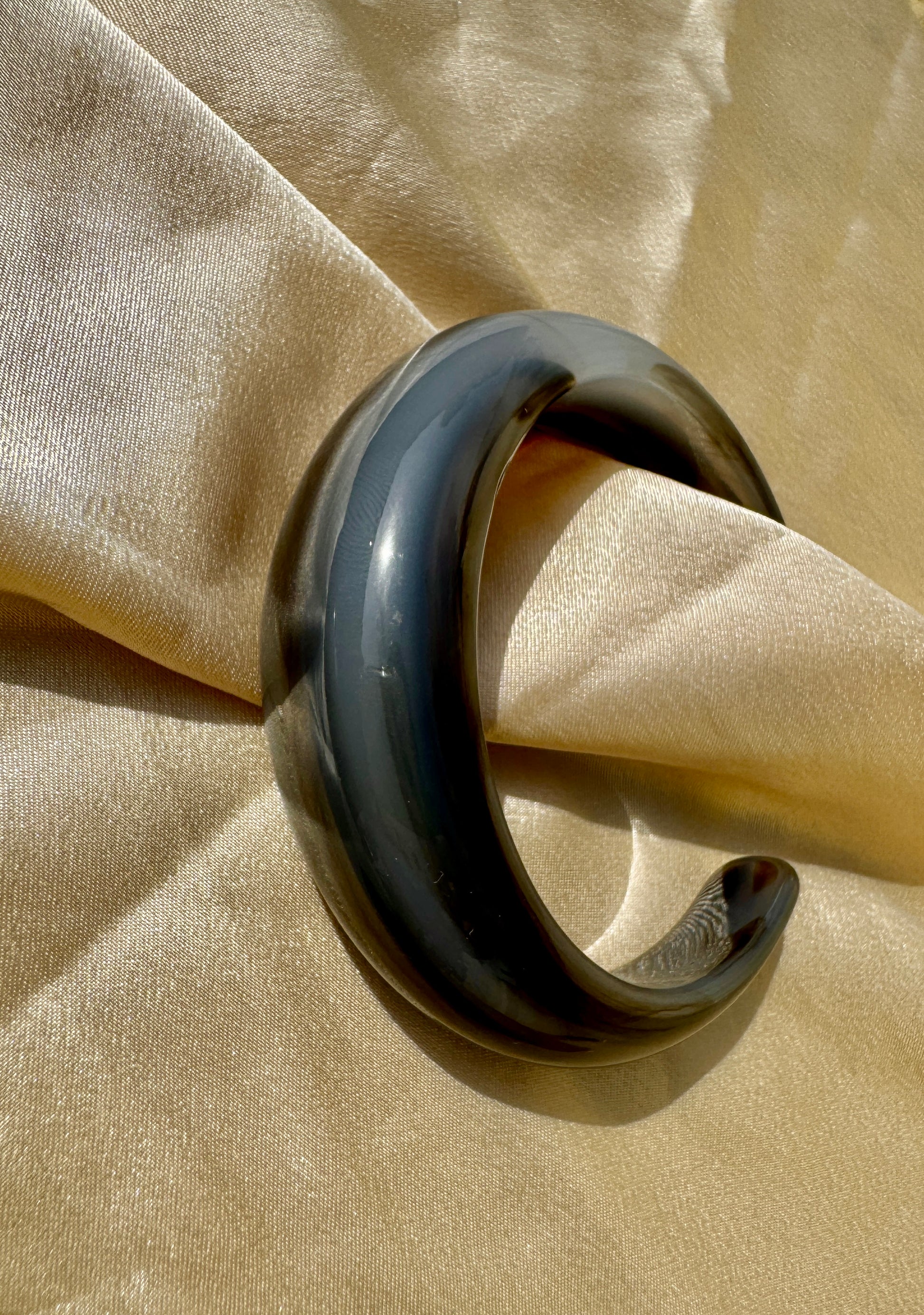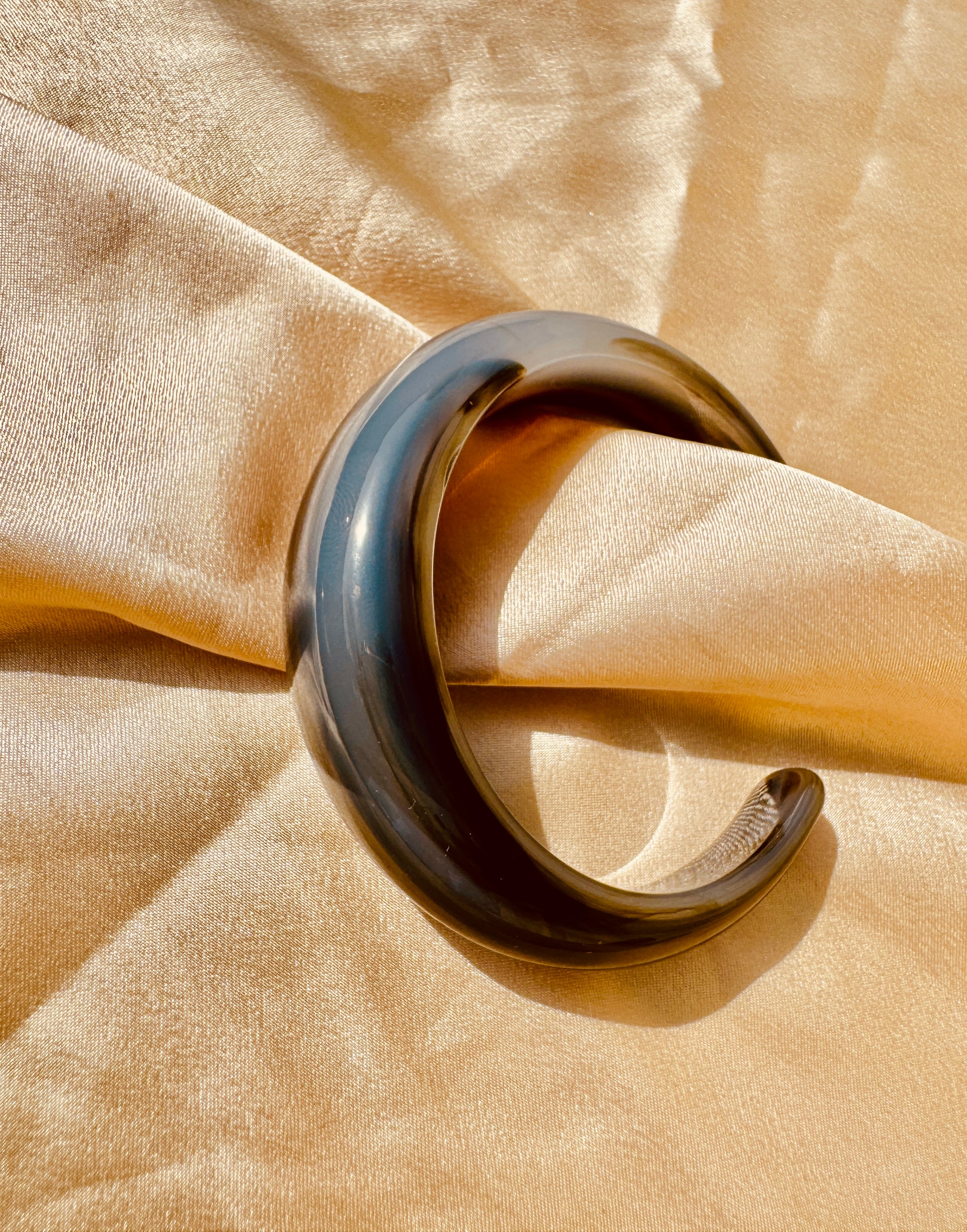 Mysterious, sleek, and endlessly sophisticated – Noire is a statement resin bangle crafted in an intense espresso-black tone with a high-gloss finish. Its sculptural open cuff silhouette embodies bold minimalism, making it the perfect accessory for power dressing and evening elegance alike. Pair it with neutrals for a striking contrast or let it blend seamlessly with dark, luxe palettes.
