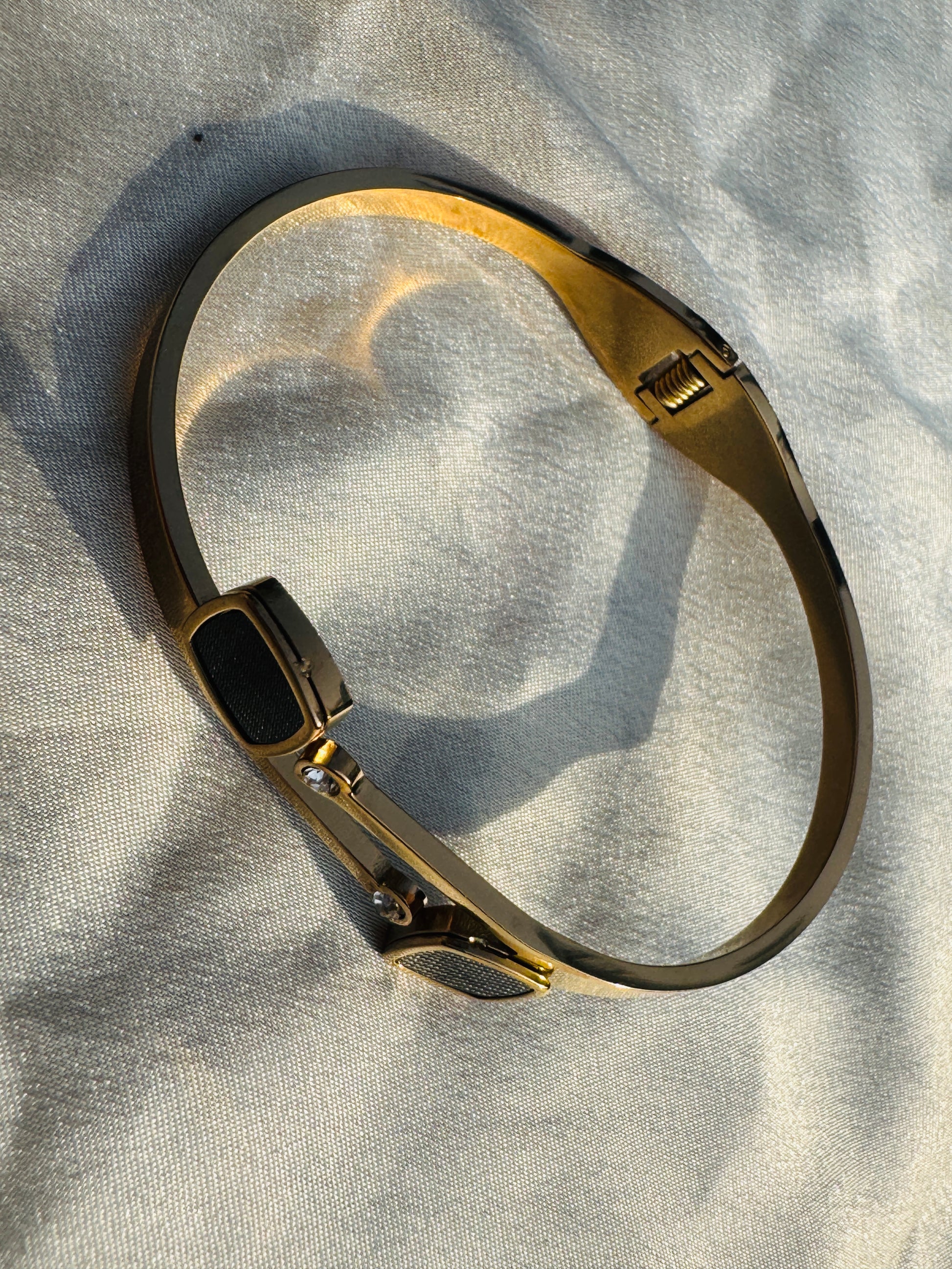 A sleek gold-plated bracelet featuring bold black enamel accents for a modern, high-fashion finish