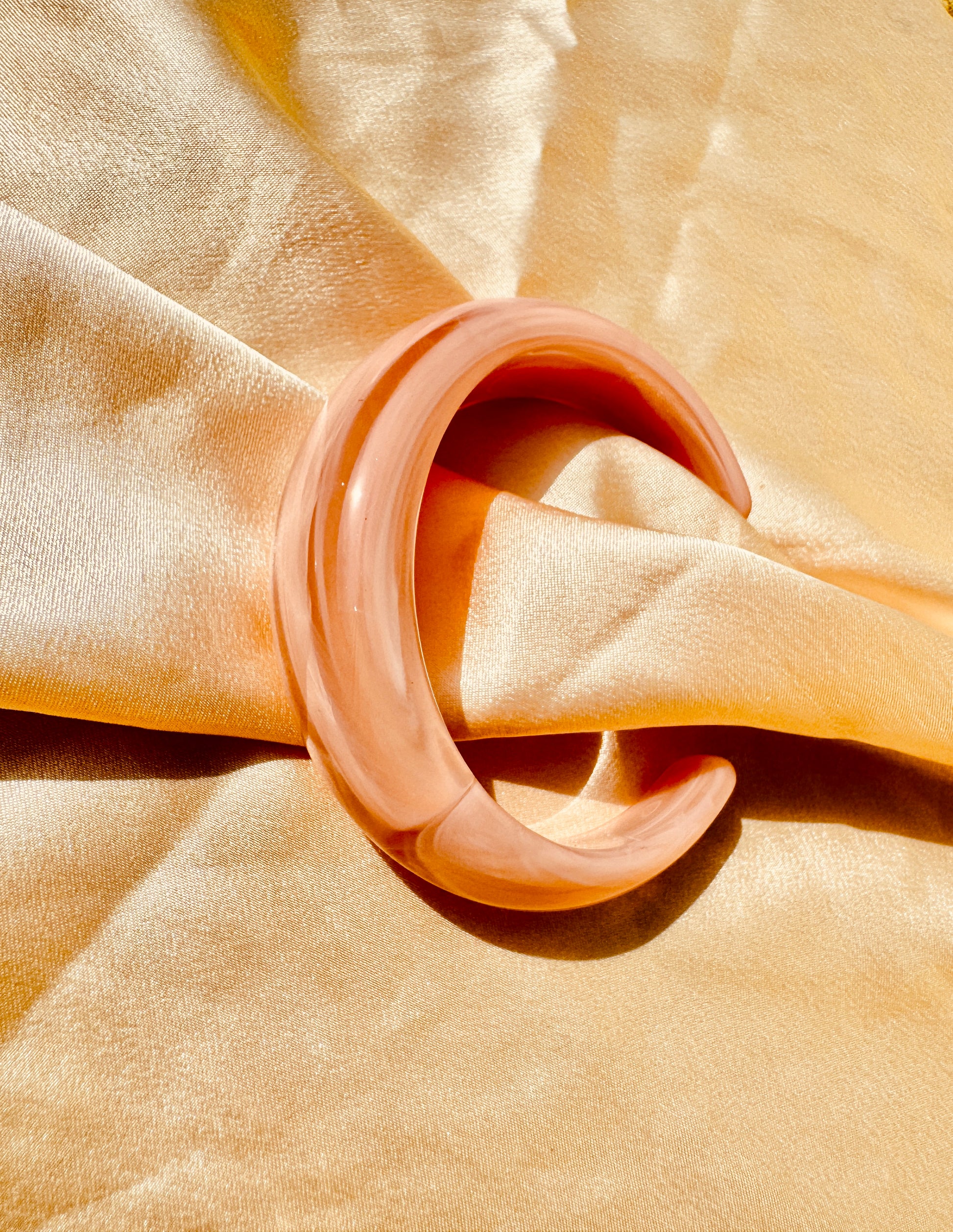 Soft, graceful, and effortlessly chic – Serene is your perfect resin bangle, designed in a delicate blush hue with a glossy, marble-kissed finish. Its sculptural open cuff silhouette blends timeless femininity with a modern edge, making it an essential statement piece for understated elegance.