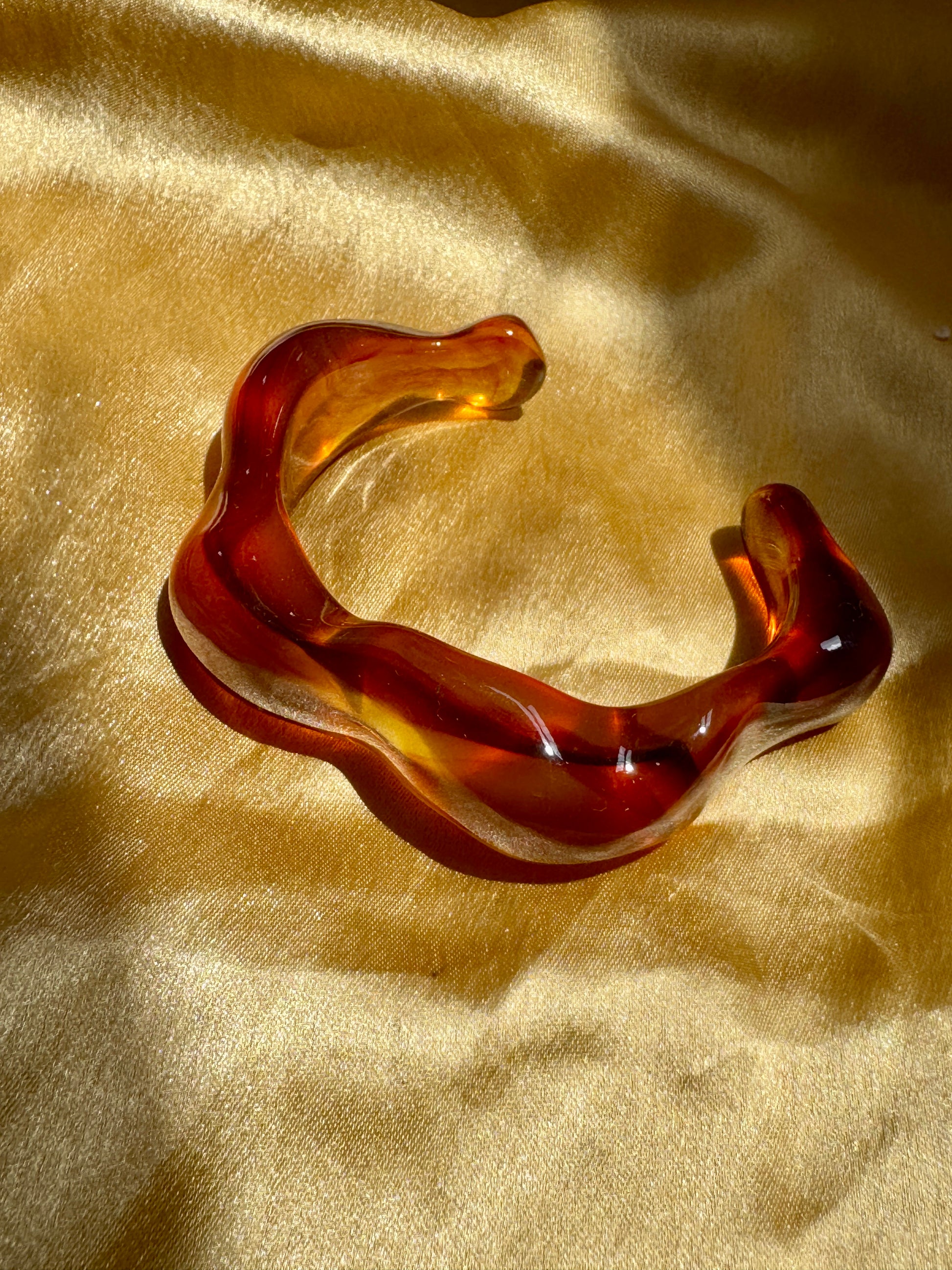 Ignite your style with the Solara Wave Cuff, a sculptural bracelet crafted in a glowing amber resin. Its molten wave-inspired silhouette evokes the movement of fire and flowing light, radiating warmth and vitality.